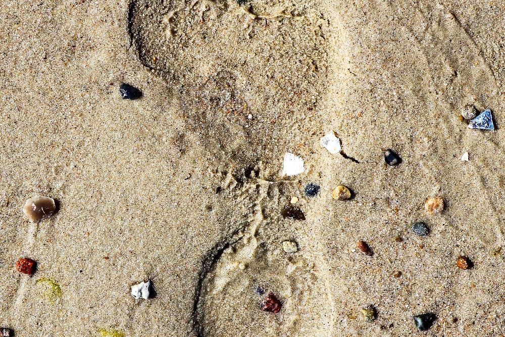 Enkele voetafdruk in het zand op het strand van de Oostzee