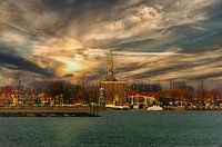 Skyline van Enkhuizen het vissersdorp aan het IJsselmeer gezien over het water vanaf de Enkhuizerdijk.