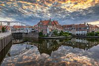 Enkhuizen is een stad en gemeente in de regio West-Friesland, in de Nederlandse provincie Noord-Holland. De gemeente ligt aan zowel het Markermeer als het IJsselmeer. Een foto van een historisch deel van Enkhuizen, genaamd de Bocht, bij zonsopkomst.