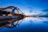De Enneüs Heermabrug bij IJburg, in de volksmond "de tietenbrug" genoemd is de verbinding van Amsterdam naar IJburg. Foto gemaakt tijdens het zgn "blauwe uurtje" Door de weerspiegeling ontstaat een bijzonder effect.