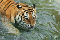Enorme starende ogen Jonge mooie tijger met expressieve ogen loopt op het water (baden), Predator's snuit close-up.