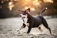 Entlebucher sennenhond spelend in het zand met zonsondergang bij een zandverstuiving