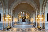 Symmetrisch beeld van de entree van het Vredespaleis in Den Haag, waarin het Permanente Hof van Arbitrage, het Internationaal Gerechtshof van de Verenigde Naties en de Haagse Academie voor Internationaal Recht zijn gehuisvest. Het Vredespaleis is het wereldwijde icoon van vrede en recht.
