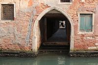 een doorkijkje door een oude ingang naar een plaatsje via een kanaaltje in Venetië. Mooie oude ramen van hout en smeedwerk.