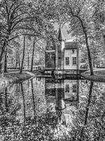 De entreepoort van de Friese State - Epema State- nabij Sneek gezien tussen de bomen en weerspiegeld in het stilstaande water.