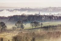 Mist die hangt over het Heuvelland tussen Epen en de Belgische grens met de kerk van Sippenaken als herkenningspunt.