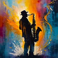 Koop dit digital art kunstwerk Epische Saxofoonvoorstelling - Abstract Silhouet Kunst van MIROKKU als reproductie geprint op canvas, aluminium dibond, (ingelijste) fotoprint, behang en ArtFrame. Voor jou op maat geprint in Fine-Art kwaliteit.