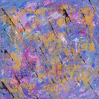 Dit abstracte kunstwerk is met de hand geschilderd in mijn atelier in Italië. Het is helder en kleurrijk, maar toch getemperd met een diepte en een element van beweging dat de aandacht trekt. Roze, blauwe, gouden en paarse verf, met extra witte en groene accenten, is aangebracht met een bouwvakkersspaan om een textuur en schraapsel aan…
