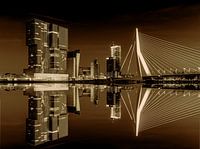 En cityscape foto van de Erasmusbrug en de Nieuwe Maas in Rotterdam, Nederland. De foto is 's nachts genomen in een warme, monochrome tint die de foto een bijzondere sfeer geeft.