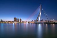 Blauw uur over de skyline van Rotterdam met uitzicht op de Erasmusbrug
