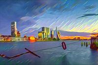 De kade aan de maas geeft een prachtig uitzicht over de skyline van Rotterdam. De blauwe tinten maken een strak kunstwerk, met mooie gele nuances. Dit geeft het schilderij sfeer en de illusie van beweging.