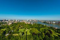Een overzicht van de stad Rotterdam vanaf de Euromast met de Erasmusbrug centraal in beeld.