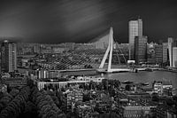 Zwart-Wit opname vanuit de Euromast van het centrum van Rotterdam met de Erasmusbrug, de Nieuwe Maas en de omliggende gebouwen