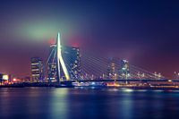 De prachtige stad Rotterdam, vastgelegd door middel van de iconische Erasmusbrug. Een stadsgezicht over de Maas. De avond, de mist en de verschillende soorten lichtkleuren maken het tot een prachtig kleurrijk schouwspel die niet misstaat boven de bank of op kantoor.