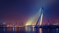 De prachtige stad Rotterdam, vastgelegd door middel van de iconische Erasmusbrug. Een stadsgezicht over de Maas. De avond, de mist en de verschillende soorten lichtkleuren maken het tot een prachtig kleurrijk schouwspel die niet misstaat boven de bank of op kantoor.