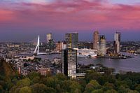 De Erasmusbrug en Kop van Zuid met Hotel New York bij zonsondergang gefotografeerd vanaf de Euromast in Rotterdam. Elke donderdag ligt het cruiseschip AIDAprima aangemeerd aan de Holland Amerikakade.