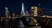 Gezicht op de Erasmusbrug en de kop van Zuid tijdens het blauwe uurtje.