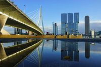 Erasmusbrug en de wolkenkrabbers op de Kop van Zuid in Rotterdam. De brug en gebouwen worden weerspiegeld in een plas die na een regenbui op de kade lag.
