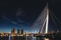 De Erasmusbrug verlicht over de Maas onder de sterrenhemel in Rotterdam, Nederland