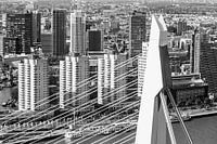 Een deel van de Erasmusbrug met een deel van de skyline van het stadscentrum van Rotterdam. Met onder andere de Markthal en de Laurenskerk en een deel van de Leuvehaven.