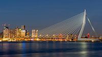 De Erasmusbrug verbindt de oude stad van Rotterdam met de Kop van Zuid op de zuidelijke oever van de Maas. Mooi verlicht tijdens het blauwe uurtje