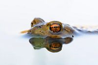 Common Toad / Erdkroete ( Bufo bufo ) while spawning season, floats on white colored water surface; waiting for its mate.