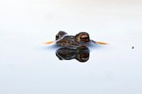 Erdkröte ( Bufo bufo ) während der Laichzeit, Männchen wartet in spiegelglattem Wasser auf ein Weibchen, spiegelt sich auf der Wasseroberfläche, kleines Insekt setzt einen lustigen Akzent, helles, freundliches Bild, wildlife, Europa