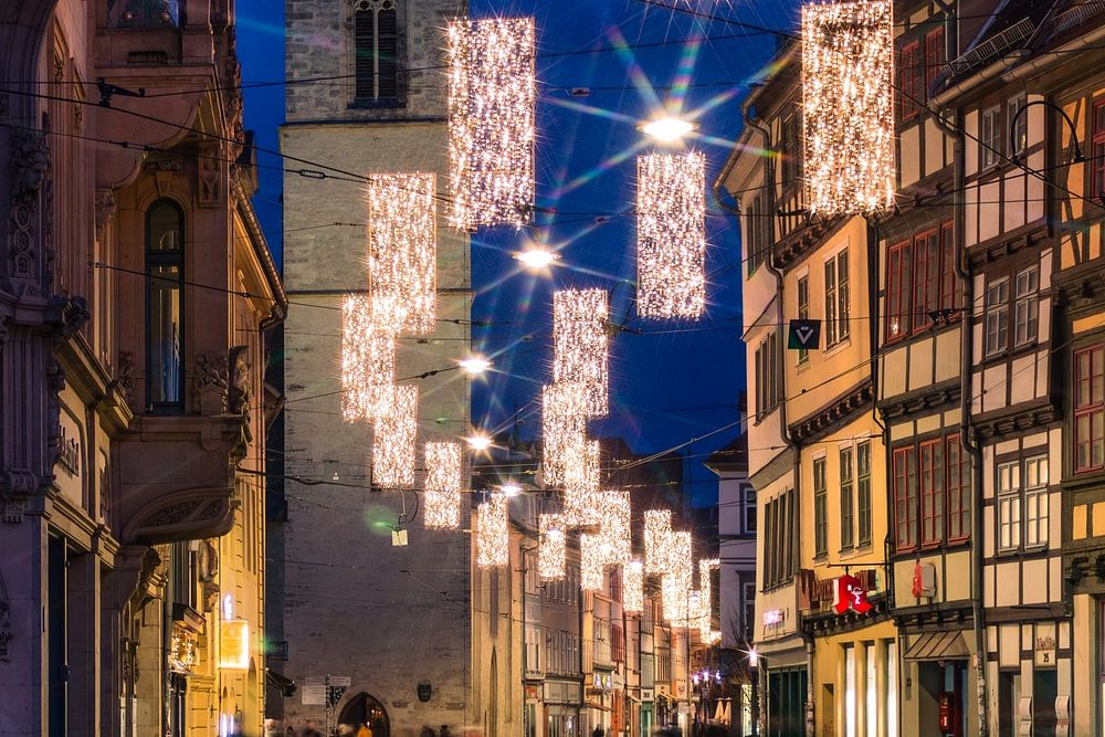 De foto toont de Marktstraße van Erfurt in de aanloop naar Kerstmis - een centrale as van de oude stad, gevangen in een moment tussen het alledaagse leven en de feestelijke sfeer. Rechthoekige lichtelementen hangen boven de geplaveide straat en structureren de ruimte als verlichte ramen. Historische gebouwen met feestelijk versierde etalages omzomen de straat, terwijl op de achtergrond de opvallende toren van een kerk oprijst. Mensen bewegen zich door het tafereel, wat het beeld een levendige maar onbewogen dynamiek geeft. De tramrails leiden de blik van de kijker de diepte in en verbinden de verschillende picturale elementen.