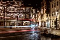 De foto toont de vismarkt van Erfurt in de kersttijd in een nachtelijke scène. In het midden staat een tram waarvan de beweging zichtbaar is gemaakt als een lichtspoor door een lange belichting. De omliggende historische gebouwen zijn feestelijk verlicht, met verlichte ramen en kerstversieringen. De geplaveide straat en een beplante kuip op de voorgrond geven diepte en structuur aan de scène. Onscherpe voorbijgangers verwijzen naar het stadsleven zonder het moment te overdrijven.