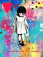 Dit kunstwerk toont een jong meisje met een felrode ballon in haar ene hand en een stuk speelgoed in de andere. De scène ontvouwt zich met levendige en dynamische graffitikleuren en combineert de onschuld van de kindertijd met de scherpe esthetiek van straatkunst. Het geeft een ontroerend commentaar op de botsing tussen het stadsleven…