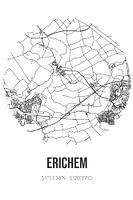 Zwart-witte landkaart, stratenplan of plattegrond van Erichem. Erichem is gelegen in de Betuwe, in de gemeente Buren, provincie Gelderland. Op de stadskaart zijn alle openbare wegen in Erichem opgenomen. Verder is de kaart voorzien van de coördinaten van het centrum van Erichem.
