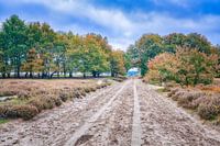 Ermelo Heide is gelegen op de Veluwe in de Nederlandse provincie Gelderland. Een bospad omgeven door bomen in herfstkleuren.