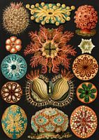 Illustration showing a variety of sea squirts. Ascidiae. - Seescheiden, 1 print : lithograph, color ; sheet 36 x 26 cm., 1904. Ernst Haeckel 1834 – 1919 German biologist, naturalist, philosopher, physician, professor, and artist who discovered, described and named thousands of new species, mapped a genealogical tree relating all life forms, and coined many terms in biology, including anthropogeny, ecology, phylum, phylogeny, stem cell, and Protista.