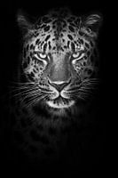 Koop dit portret Ernstig minimalistisch portret van een besnorde koude luipaard die streng kijkt uit de nacht, zwart- van Michael Semenov op canvas, aluminium dibond, (ingelijste) fotoprint, behang en ArtFrame, op maat geprint in Fine-Art kwaliteit.