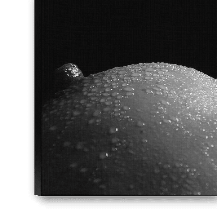 Deze sensuele zwart-witfoto vangt de kracht en elegantie van het vrouwelijk lichaam in een sfeervolle lowkey-setting, waarin licht en schaduw op verfijnde wijze samensmelten. Het naaktmodel is bedekt met glinsterende waterdruppels en subtiel verspreide ijsblokjes, die samen een intrigerend contrast oproepen tussen kou en warmte. Dit spanningsveld versterkt niet alleen de fysieke uitstraling, maar voegt ook een symbolische gelaagdheid toe: fragiliteit versus kracht, kilte tegenover verlangen.