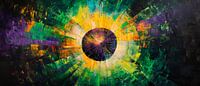 Er bloeit een fascinerend kleurenspel op, met een donker centrum dat het licht in levendige tinten weerkaatst. De dynamische stralen van groen, geel en paars geven de kamer een energieke sfeer. Dit kunstwerk is perfect voor een moderne woonkamer, waar het een inspirerende sfeer en gespreksstof creëert.