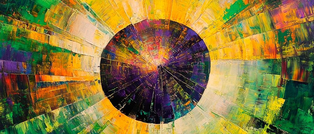 Er bloeit een fascinerend kleurenspel op, met een donker centrum dat het licht in levendige tinten weerkaatst. De dynamische stralen van groen, geel en paars geven de kamer een energieke sfeer. Dit kunstwerk is perfect voor een moderne woonkamer, waar het een inspirerende sfeer en gespreksstof creëert.