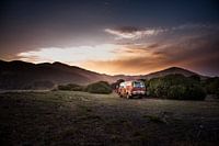 Escape campervan geparkeerd op het strand van Akaroa in Nieuw-Zeeland.