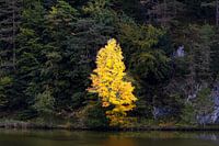 In de glooiende heuvels van de Allgäu, aan de oevers van het Obersee bij Füssen, rijst een esdoorn majestueus op in zijn herfstpracht. Zijn gebladerte gloeit in warme gele tinten, alsof de zon er zelf in gevangen zit. Een stralende verklaring van het afscheid van de zomer terwijl de natuur zich opmaakt voor de sluimer van de winter.