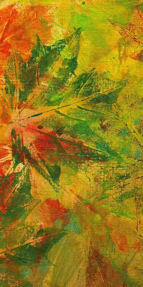 Levendig groen, rood en geel vormen een abstracte compositie van elkaar overlappende bladeren. De herfsttinten lopen naadloos in elkaar over en roepen een gevoel van seizoensovergang op.