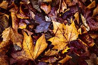 Esdoornbladeren op bruin gebladerte in winterse vergankelijkheid en dood