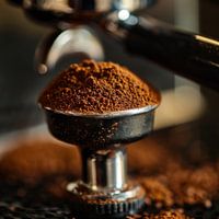 Dit elegante kunstwerk toont vers gemalen espressopoeder in een glanzende portafilter, klaar voor het perfecte kopje koffie. Het minutieuze detail en de contrasterende achtergrond benadrukken de textuur en versheid van de koffie. Deze afbeelding is ideaal voor cafés, keukens of kantoren en laat de kunst van het koffiezetten in stijl zien.