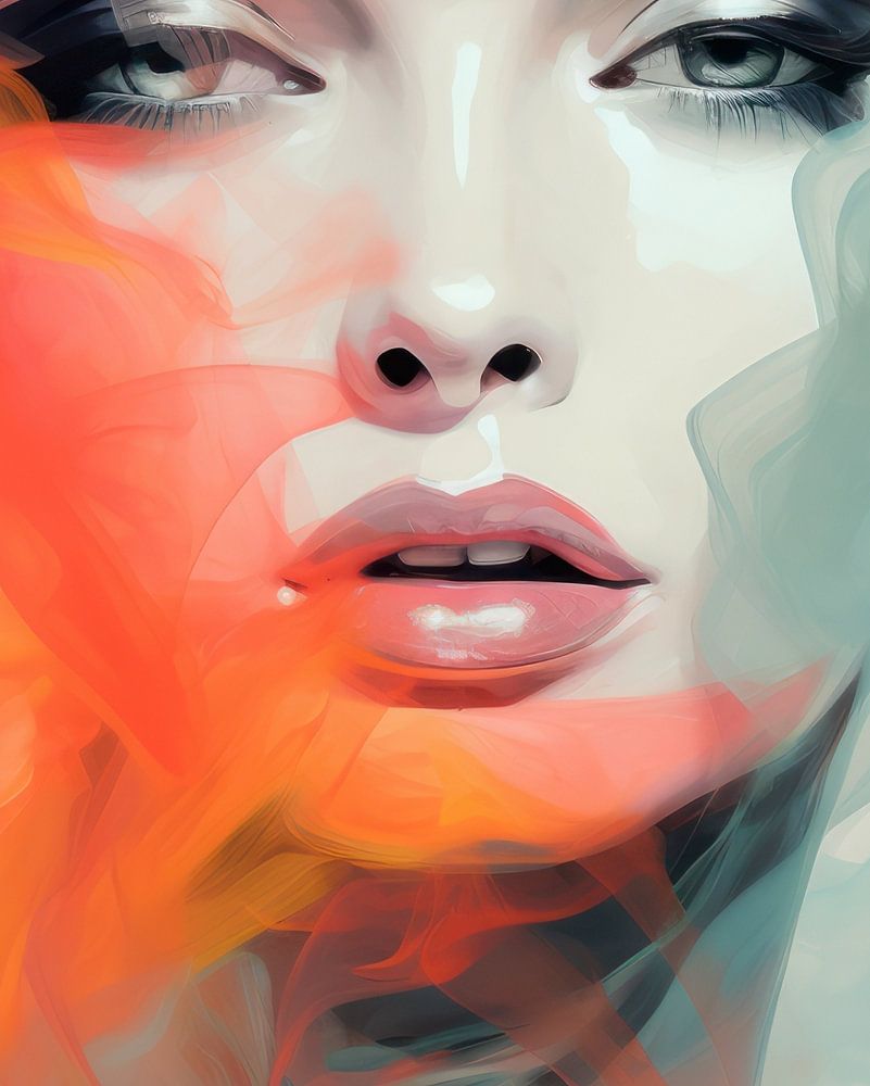 "Essentie van Expressie: Vurige Blik" is een fascinerende afbeelding die de krachtige dynamiek van vrouwelijke expressie vangt, omhuld door abstracte, rookachtige vormen. De vloeiende overgang van intense oranjetinten naar zachte grijzen weerspiegelt een innerlijke gloed en passie. Dit kunstwerk zou perfect passen in een hedendaags interieur, denk aan een stijlvolle lounge, een avant-gardistische galerij of een elegante slaapkamer. De artistieke flair en het kleurenpalet kunnen een vleugje moderne verfijning aan elke ruimte toevoegen, terwijl het tegelijkertijd een diepgang en emotie uitstraalt die de aandacht van elke toeschouwer zal trekken.