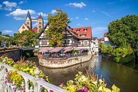 De vakwerkhuizen en de imposante kerk dienen als decor voor deze unieke afbeelding. Elk detail vangt de rijke geschiedenis en de authentieke sfeer van Esslingen am Neckar op, waardoor het een ideale toevoeging is aan jouw interieur.