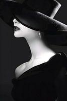 Een jonge vrouw poseert tijdens een modeshoot in een elegante zwart-witfoto. Met sierlijk charisma en een stijlvolle pose belichaamt ze tijdloze schoonheid en modieus zelfvertrouwen. De focus ligt op haar esthetische verschijning en haar uitdrukking, die glamour en chic combineert. Het beeld straalt een tijdloze elegantie uit en vangt de essentie van de modekunst in één enkel moment. Een portret vol stijl en klasse dat de schoonheid van mode en vrouwelijke expressie vastlegt.