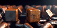 Roestige stalen blokken in het midden van de afbeelding tegen een vage achtergrond staan voor kracht en duurzaamheid ondanks verval en veroudering. Het werk weerspiegelt de hedendaagse voorkeur voor materialen en hun verouderingsprocessen in combinatie met minimalisme, wat wordt benadrukt door de heldere compositie en concentratie op de essentie.