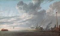 Estuary at Day's End, Simon de Vlieger De meest vernieuwende schilderijen van Simon de Vlieger, waaronder deze Estuary at Day's End, geven de smaak van het dagelijks leven langs de Nederlandse kust weer. In deze ingetogen en gevoelige compositie brengen twee arbeiders teer aan op de romp van een schip dat bij eb op een zandbank ligt. Zwarte rook van het vuur dat de teer verhit stijgt op naar de torenhoge wolken, terwijl dramatische lichtstralen door de dunnere wolkenlaag links breken. Op de achtergrond ontsnapt rook uit het kanon van een groot Nederlands schip dat een saluut afvuurt. Het tafereel is eenvoudig, maar de effecten van licht en sfeer geven het schilderij een enorm gevoel van drama, en deze kwaliteiten komen volledig tot hun recht dankzij de opmerkelijke staat waarin het werk verkeert. De Vlieger was een van de belangrijkste en invloedrijkste Nederlandse marineschilders. Hij was een veelzijdig kunstenaar, die zich even goed thuis voelde in het schilderen van dramatische stormen of statige marineparades, die hij opluisterde met kleine figuren die zorgvuldig in de picturale context werden geplaatst. Hij kende duidelijk de zee en de schepen die erop voeren: hij legde de onderscheidende kenmerken van de verschillende soorten schepen - van grote marineschepen tot kleine vissers- en transportboten - nauwkeurig vast en zette ze overtuigend in het water. Maar De Vliegers gevoeligheid voor de atmosferische effecten van water en lucht langs de Noordzee onderscheidt hem echt van de meeste andere marineschilders. Hij was ongeëvenaard in het vastleggen van de subtiele grijzen en grijs-blauwen.