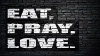 Eten, bidden, liefhebben - motiverende slogan op zwarte bakstenen muur