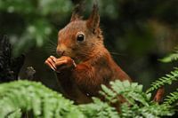De eekhoorn eet een nootje terwijl hij achter groene varens zit. Hij heeft grappige lange klauwen waarmee hij makkelijk in bomen kan klimmen en van tak naar tak kan springen.