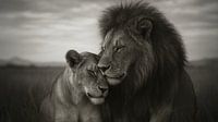 De monochrome tonen versterken de emotionele intensiteit van het beeld. Zonder kleur blijft enkel de essentie over: liefde, rust en vertrouwen. De leeuw met zijn imposante manen en de sierlijke leeuwin verbeelden samen een tijdloos verhaal van partnerschap, loyaliteit en bescherming.